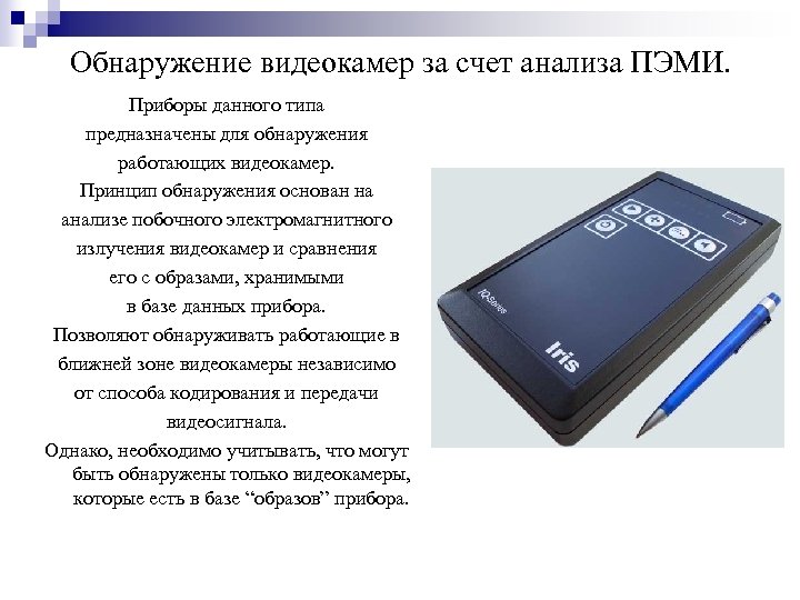 Обнаружение видеокамер за счет анализа ПЭМИ. Приборы данного типа предназначены для обнаружения работающих видеокамер. Принцип обнаружения основан на анализе побочного электромагнитного излучения видеокамер и сравнения его с образами, хранимыми в базе данных прибора. Позволяют обнаруживать работающие в ближней зоне видеокамеры независимо от способа кодирования и передачи видеосигнала. Однако, необходимо учитывать, что могут быть обнаружены только видеокамеры, которые есть в базе “образов” прибора.