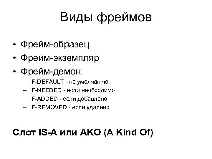 Виды фреймов • Фрейм-образец • Фрейм-экземпляр • Фрейм-демон: – – IF-DEFAULT - по умолчанию IF-NEEDED - если необходимо IF-ADDED - если добавлено IF-REMOVED - если удалено Слот IS-A или AKO (A Kind Of)