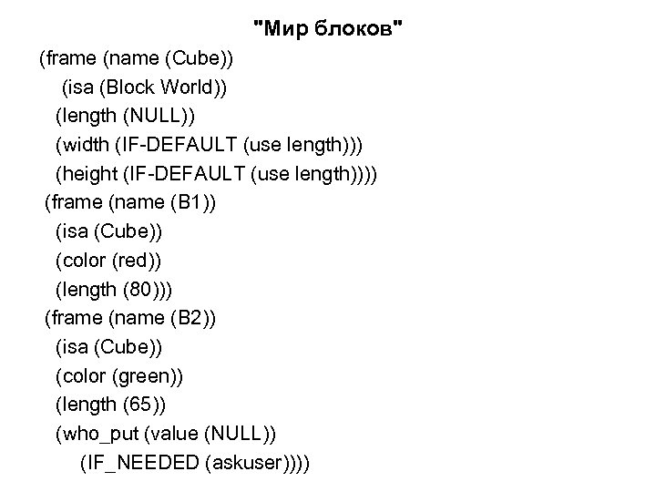 "Мир блоков" (frame (name (Cube)) (isa (Block World)) (length (NULL)) (width (IF-DEFAULT (use length))) (height (IF-DEFAULT (use length)))) (frame (name (B 1)) (isa (Cube)) (color (red)) (length (80))) (frame (name (B 2)) (isa (Cube)) (color (green)) (length (65)) (who_put (value (NULL)) (IF_NEEDED (askuser))))