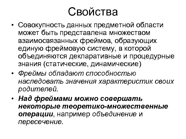 Свойства • Совокупность данных предметной области может быть представлена множеством взаимосвязанных фреймов, образующих единую фреймовую систему, в которой объединяются декларативные и процедурные знания (статические, динамические) • Фреймы обладают способностью наследовать значения характеристик своих родителей. • Над фреймами можно совершать некоторые теоретико-множественные операции, например объединение и пересечение.