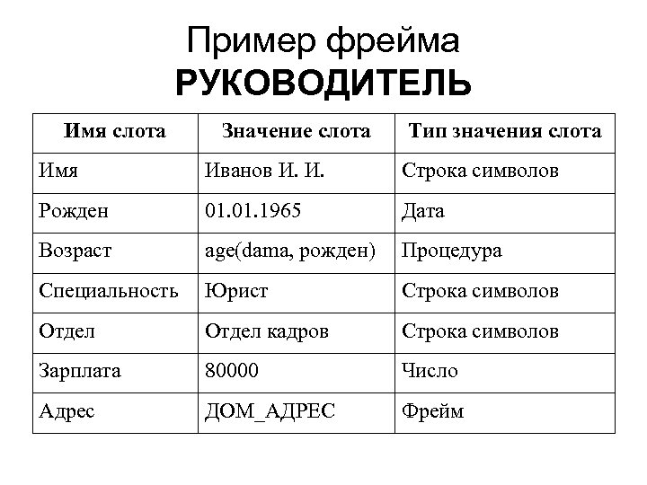 Пример фрейма РУКОВОДИТЕЛЬ Имя слота Значение слота Тип значения слота Имя Иванов И. И. Строка символов Рожден 01. 1965 Дата Возраст age(dama, рожден) Процедура Специальность Юрист Строка символов Отдел кадров Строка символов Зарплата 80000 Число Адрес ДОМ_АДРЕС Фрейм