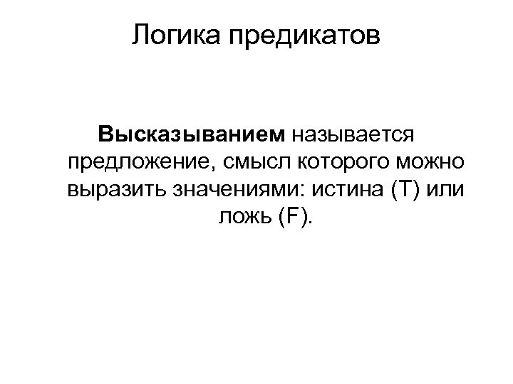 Логика предикатов Высказыванием называется предложение, смысл которого можно выразить значениями: истина (Т) или ложь (F).
