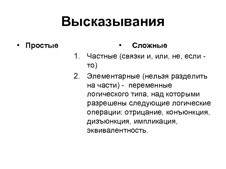 Высказывания • Простые • Сложные 1. Частные (связки и, или, не, если то) 2. Элементарные (нельзя разделить на части) - переменные логического типа, над которыми разрешены следующие логические операции: отрицание, конъюнкция, дизъюнкция, импликация, эквивалентность.