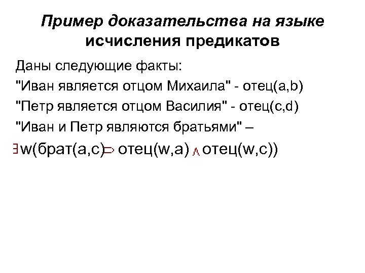 Пример доказательства на языке исчисления предикатов Даны следующие факты: "Иван является отцом Михаила" - отец(a, b) "Петр является отцом Василия" - отец(c, d) "Иван и Петр являются братьями" – w(брат(a, c) отец(w, a) отец(w, c))
