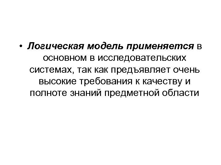 • Логическая модель применяется в основном в исследовательских системах, так как предъявляет очень высокие требования к качеству и полноте знаний предметной области