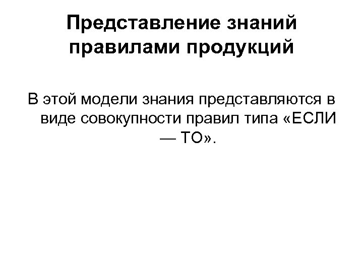 Представление знаний правилами продукций В этой модели знания представляются в виде совокупности правил типа «ЕСЛИ — ТО» .