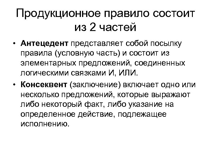 Продукционное правило состоит из 2 частей • Антецедент представляет собой посылку правила (условную часть) и состоит из элементарных предложений, соединенных логическими связками И, ИЛИ. • Консеквент (заключение) включает одно или несколько предложений, которые выражают либо некоторый факт, либо указание на определенное действие, подлежащее исполнению.