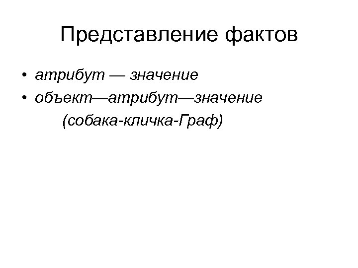 Представление фактов • атрибут — значение • объект—атрибут—значение (собака-кличка-Граф)