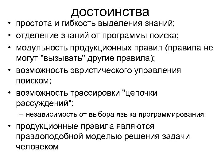 достоинства • простота и гибкость выделения знаний; • отделение знаний от программы поиска; • модульность продукционных правил (правила не могут "вызывать" другие правила); • возможность эвристического управления поиском; • возможность трассировки "цепочки рассуждений"; – независимость от выбора языка программирования; • продукционные правила являются правдоподобной моделью решения задачи человеком