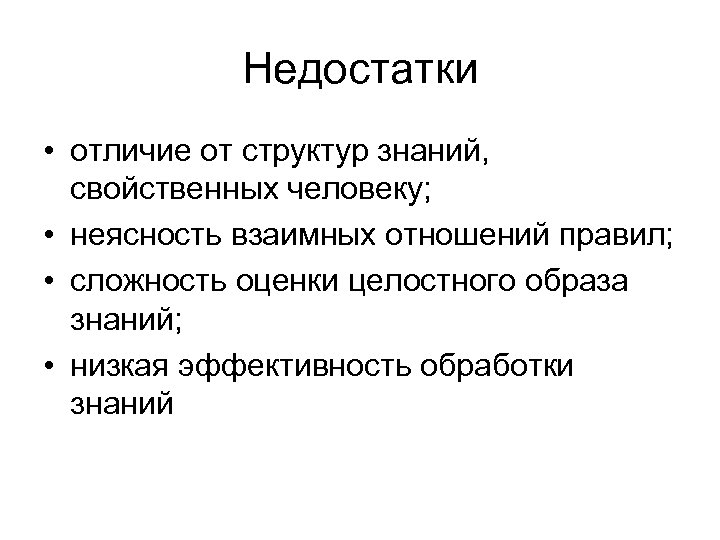 Недостатки • отличие от структур знаний, свойственных человеку; • неясность взаимных отношений правил; • сложность оценки целостного образа знаний; • низкая эффективность обработки знаний