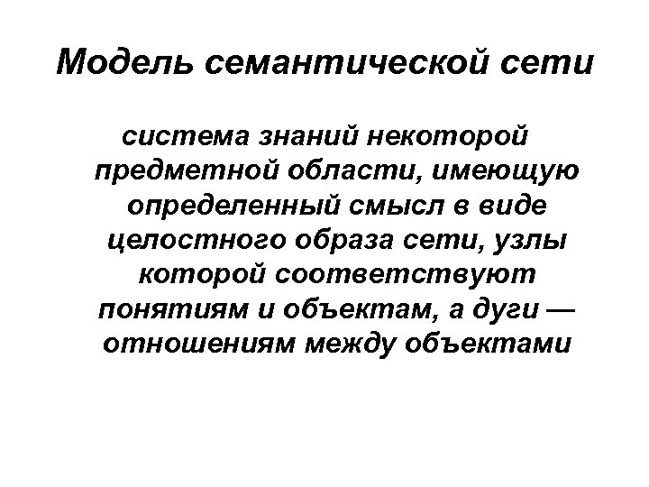 Модель семантической сети система знаний некоторой предметной области, имеющую определенный смысл в виде целостного образа сети, узлы которой соответствуют понятиям и объектам, а дуги — отношениям между объектами