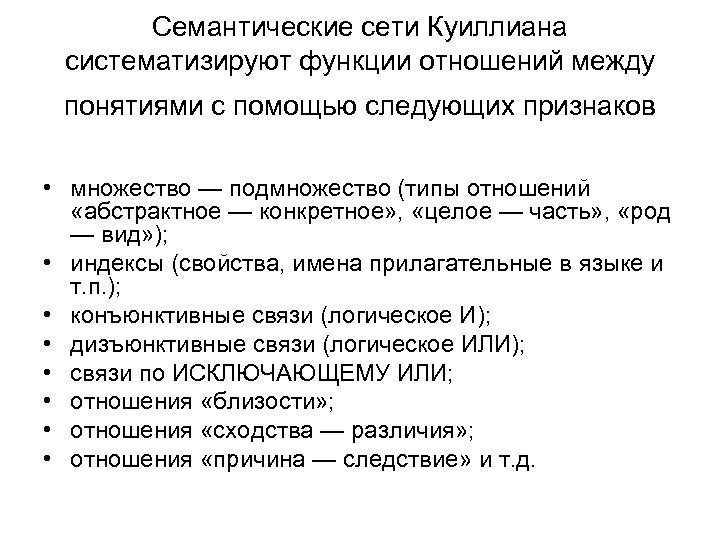 Семантические сети Куиллиана систематизируют функции отношений между понятиями с помощью следующих признаков • множество — подмножество (типы отношений «абстрактное — конкретное» , «целое — часть» , «род — вид» ); • индексы (свойства, имена прилагательные в языке и т. п. ); • конъюнктивные связи (логическое И); • дизъюнктивные связи (логическое ИЛИ); • связи по ИСКЛЮЧАЮЩЕМУ ИЛИ; • отношения «близости» ; • отношения «сходства — различия» ; • отношения «причина — следствие» и т. д.