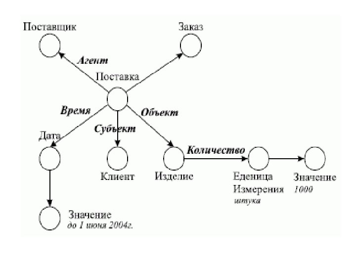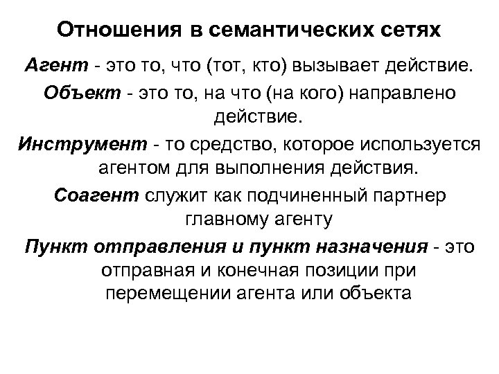 Отношения в семантических сетях Агент - это то, что (тот, кто) вызывает действие. Объект - это то, на что (на кого) направлено действие. Инструмент - то средство, которое используется агентом для выполнения действия. Соагент служит как подчиненный партнер главному агенту Пункт отправления и пункт назначения - это отправная и конечная позиции при перемещении агента или объекта