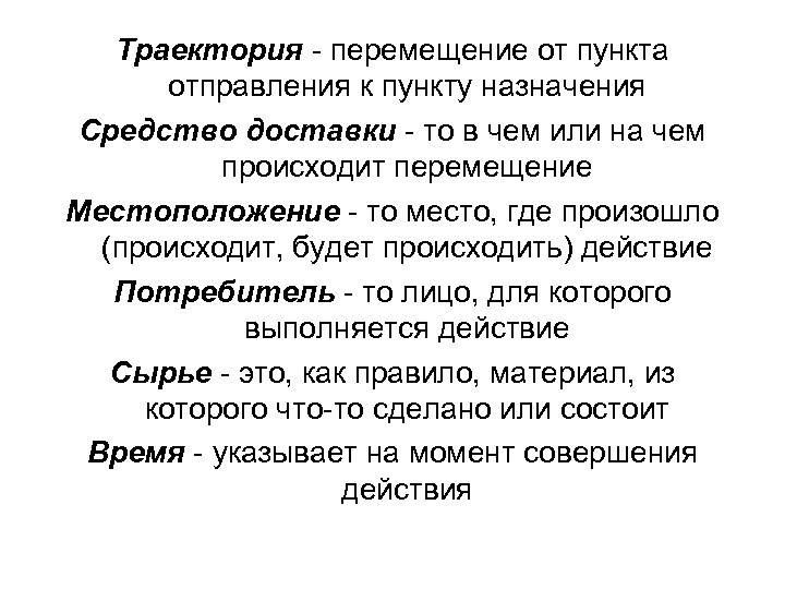 Траектория - перемещение от пункта отправления к пункту назначения Средство доставки - то в чем или на чем происходит перемещение Местоположение - то место, где произошло (происходит, будет происходить) действие Потребитель - то лицо, для которого выполняется действие Сырье - это, как правило, материал, из которого что-то сделано или состоит Время - указывает на момент совершения действия