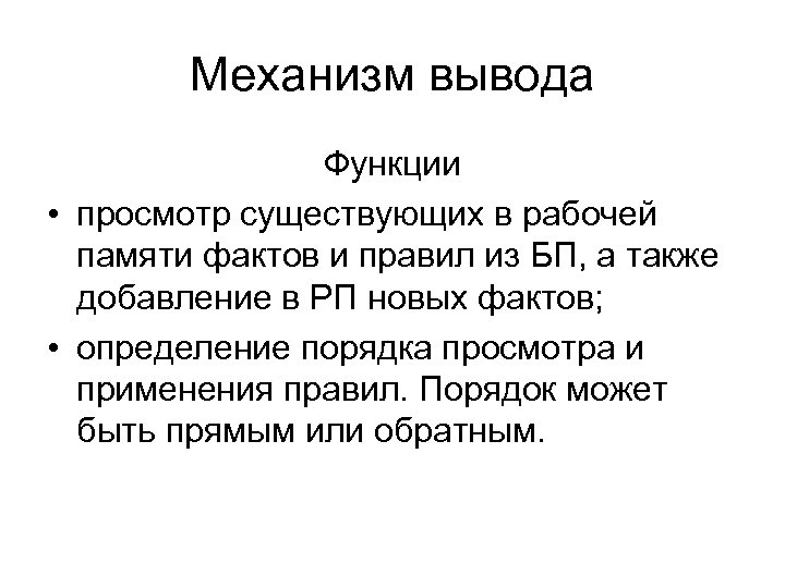 Механизм вывода Функции • просмотр существующих в рабочей памяти фактов и правил из БП, а также добавление в РП новых фактов; • определение порядка просмотра и применения правил. Порядок может быть прямым или обратным.