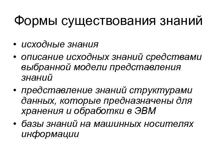 Формы существования знаний • исходные знания • описание исходных знаний средствами выбранной модели представления знаний • представление знаний структурами данных, которые предназначены для хранения и обработки в ЭВМ • базы знаний на машинных носителях информации