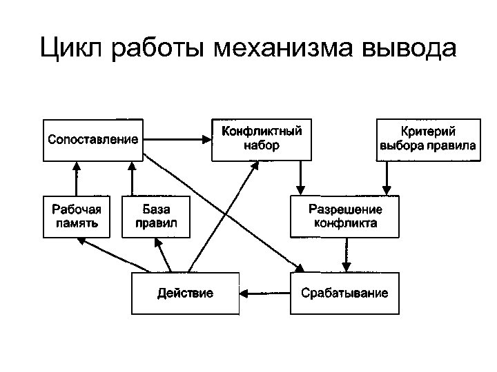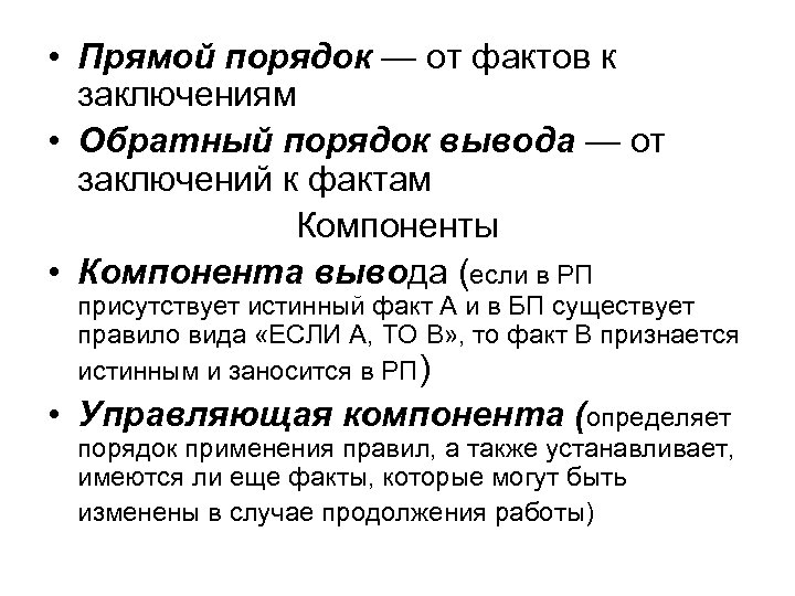 • Прямой порядок — от фактов к заключениям • Обратный порядок вывода — от заключений к фактам Компоненты • Компонента вывода (если в РП присутствует истинный факт А и в БП существует правило вида «ЕСЛИ А, ТО В» , то факт В признается истинным и заносится в РП) • Управляющая компонента (определяет порядок применения правил, а также устанавливает, имеются ли еще факты, которые могут быть изменены в случае продолжения работы)