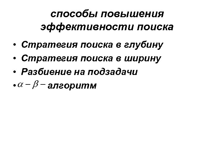 способы повышения эффективности поиска • Стратегия поиска в глубину • Стратегия поиска в ширину • Разбиение на подзадачи • алгоритм