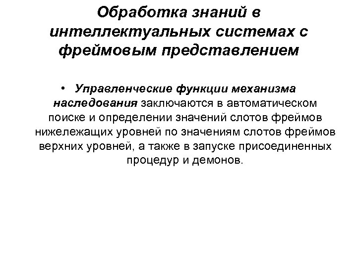 Обработка знаний в интеллектуальных системах с фреймовым представлением • Управленческие функции механизма наследования заключаются в автоматическом поиске и определении значений слотов фреймов нижележащих уровней по значениям слотов фреймов верхних уровней, а также в запуске присоединенных процедур и демонов.
