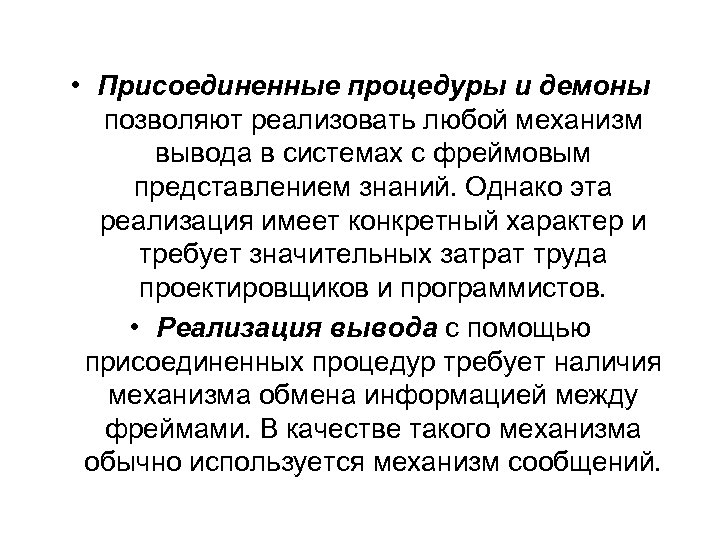 • Присоединенные процедуры и демоны позволяют реализовать любой механизм вывода в системах с фреймовым представлением знаний. Однако эта реализация имеет конкретный характер и требует значительных затрат труда проектировщиков и программистов. • Реализация вывода с помощью присоединенных процедур требует наличия механизма обмена информацией между фреймами. В качестве такого механизма обычно используется механизм сообщений.