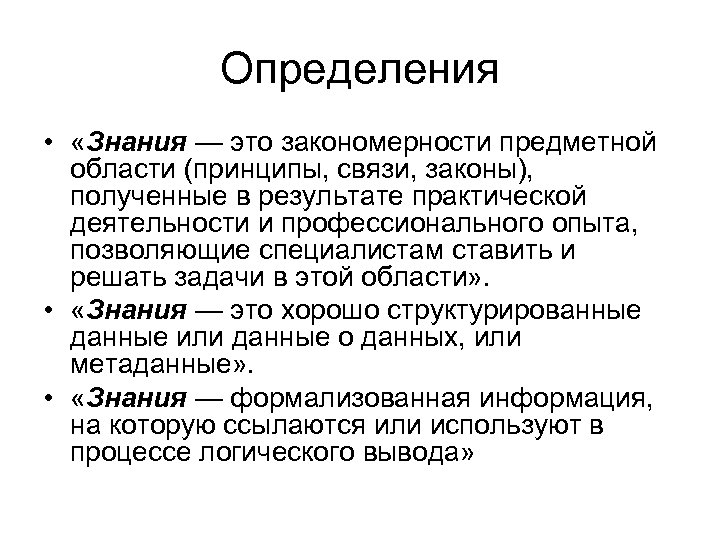Определения • «Знания — это закономерности предметной области (принципы, связи, законы), полученные в результате практической деятельности и профессионального опыта, позволяющие специалистам ставить и решать задачи в этой области» . • «Знания — это хорошо структурированные данные или данные о данных, или метаданные» . • «Знания — формализованная информация, на которую ссылаются или используют в процессе логического вывода»