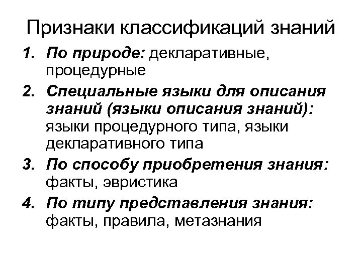 Признаки классификаций знаний 1. По природе: декларативные, процедурные 2. Специальные языки для описания знаний (языки описания знаний): языки процедурного типа, языки декларативного типа 3. По способу приобретения знания: факты, эвристика 4. По типу представления знания: факты, правила, метазнания