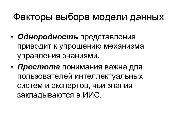Факторы выбора модели данных • Однородность представления приводит к упрощению механизма управления знаниями. • Простота понимания важна для пользователей интеллектуальных систем и экспертов, чьи знания закладываются в ИИС.