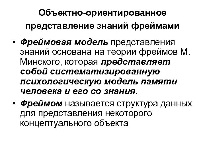 Объектно-ориентированное представление знаний фреймами • Фреймовая модель представления знаний основана на теории фреймов М. Минского, которая представляет собой систематизированную психологическую модель памяти человека и его со знания. • Фреймом называется структура данных для представления некоторого концептуального объекта