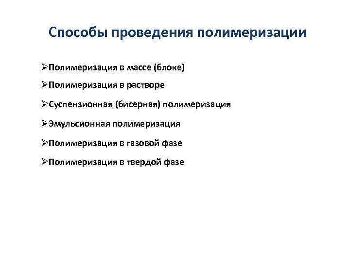 Способы проведения полимеризации ØПолимеризация в массе (блоке) ØПолимеризация в растворе ØСуспензионная (бисерная) полимеризация ØЭмульсионная полимеризация ØПолимеризация в газовой фазе ØПолимеризация в твердой фазе