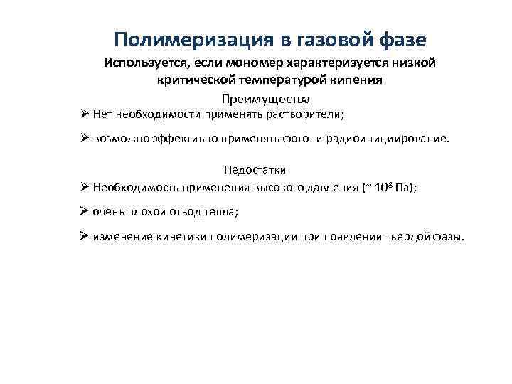 Полимеризация в газовой фазе Используется, если мономер характеризуется низкой критической температурой кипения Преимущества Ø Нет необходимости применять растворители; Ø возможно эффективно применять фото- и радиоинициирование. Недостатки Ø Необходимость применения высокого давления (~ 108 Па); Ø очень плохой отвод тепла; Ø изменение кинетики полимеризации при появлении твердой фазы.