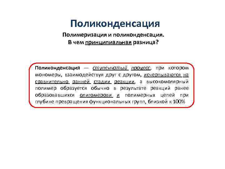Поликонденсация Полимеризация и поликонденсация. В чем принципиальная разница? Поликонденсация — ступенчатый процесс, при котором мономеры, взаимодействуя друг с другом, исчерпываются на сравнительно ранней стадии реакции, а высокомолярный полимер образуется обычно в результате реакций ранее образовавшихся олигомерови и полимерных цепей при глубине превращения функциональных групп, близкой к 100%