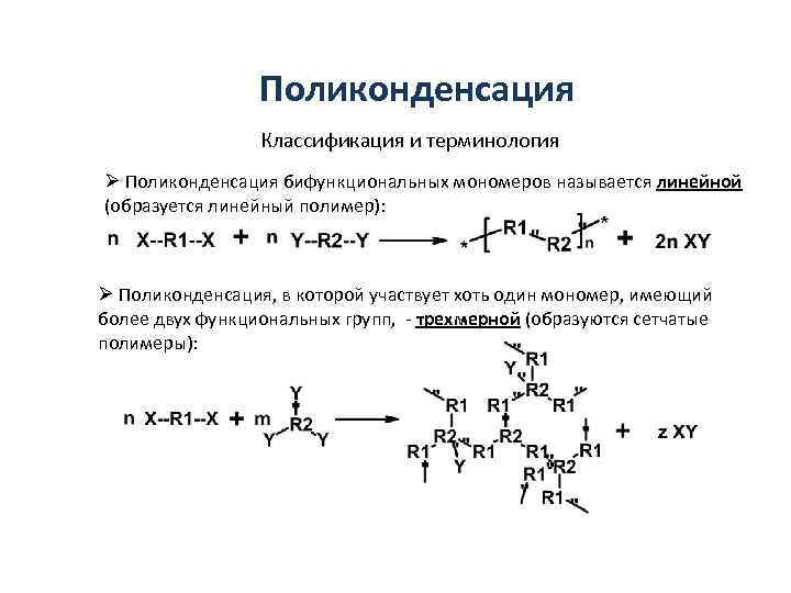 Поликонденсация Классификация и терминология Ø Поликонденсация бифункциональных мономеров называется линейной (образуется линейный полимер): Ø Поликонденсация, в которой участвует хоть один мономер, имеющий более двух функциональных групп, - трехмерной (образуются сетчатые полимеры):
