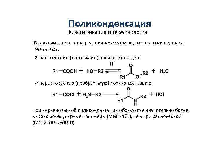 Поликонденсация Классификация и терминология В зависимости от типа реакции между функциональными группами различают: Ø равновесную (обратимую) поликонденсацию Ø неравновесную (необратимую) поликонденсацию При неравновесной поликонденсации образуются значительно более высокомолекулярные полимеры (ММ > 105), чем при равновесной (ММ 20000÷ 30000)