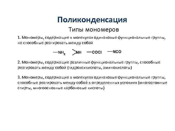 Поликонденсация Типы мономеров 1. Мономеры, содержащие в молекулах одинаковые функциональные группы, не способные реагировать между собой 2. Мономеры, содержащие различные функциональные группы, способные реагировать между собой (гидроксикислоты, аминокислоты) 3. Мономеры, содержащие в молекулах одинаковые функциональные группы, способные реагировать между собой в определенных условиях (многоатомные спирты, многоосновные карбоновые кислоты)