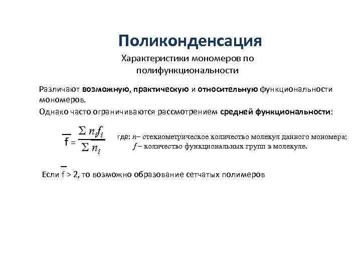 Поликонденсация Характеристики мономеров по полифункциональности Различают возможную, практическую и относительную функциональности мономеров. Однако часто ограничиваются рассмотрением средней функциональности: Σ nifi f= Σ n i где: n– стехиометрическое количество молекул данного мономера; f – количество функциональных групп в молекуле. Если f > 2, то возможно образование сетчатых полимеров
