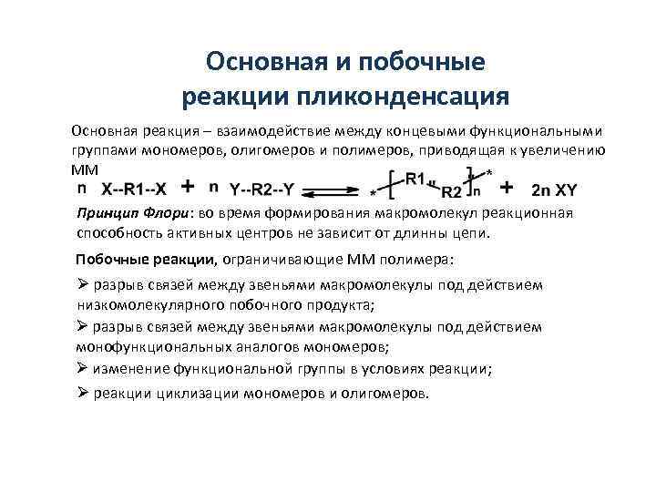 Основная и побочные реакции пликонденсация Основная реакция – взаимодействие между концевыми функциональными группами мономеров, олигомеров и полимеров, приводящая к увеличению ММ Принцип Флори: во время формирования макромолекул реакционная способность активных центров не зависит от длинны цепи. Побочные реакции, ограничивающие ММ полимера: Ø разрыв связей между звеньями макромолекулы под действием низкомолекулярного побочного продукта; Ø разрыв связей между звеньями макромолекулы под действием монофункциональных аналогов мономеров; Ø изменение функциональной группы в условиях реакции; Ø реакции циклизации мономеров и олигомеров.