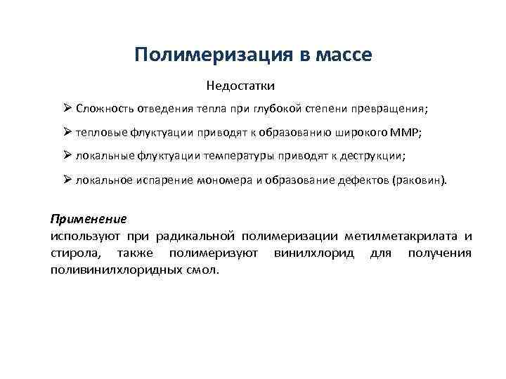 Полимеризация в массе Недостатки Ø Сложность отведения тепла при глубокой степени превращения; Ø тепловые флуктуации приводят к образованию широкого ММР; Ø локальные флуктуации температуры приводят к деструкции; Ø локальное испарение мономера и образование дефектов (раковин). Применение используют при радикальной полимеризации метилметакрилата и стирола, также полимеризуют винилхлорид для получения поливинилхлоридных смол.