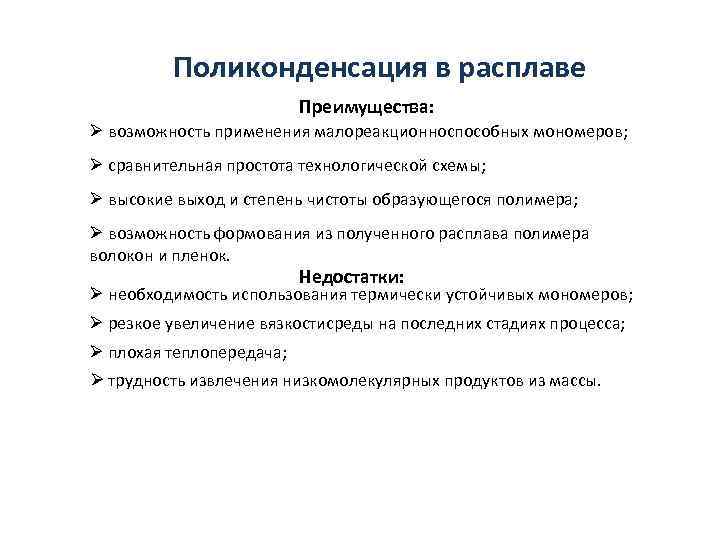 Поликонденсация в расплаве Преимущества: Ø возможность применения малореакционноспособных мономеров; Ø сравнительная простота технологической схемы; Ø высокие выход и степень чистоты образующегося полимера; Ø возможность формования из полученного расплава полимера волокон и пленок. Недостатки: Ø необходимость использования термически устойчивых мономеров; Ø резкое увеличение вязкостисреды на последних стадиях процесса; Ø плохая теплопередача; Ø трудность извлечения низкомолекулярных продуктов из массы.