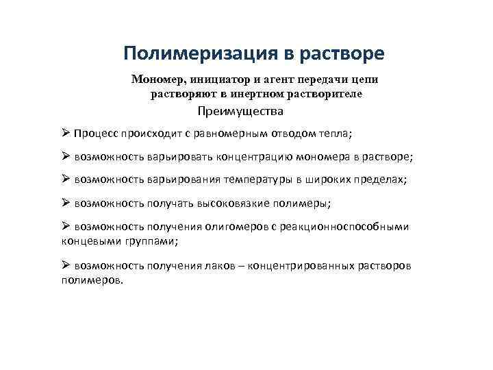 Полимеризация в растворе Мономер, инициатор и агент передачи цепи растворяют в инертном растворителе Преимущества Ø Процесс происходит с равномерным отводом тепла; Ø возможность варьировать концентрацию мономера в растворе; Ø возможность варьирования температуры в широких пределах; Ø возможность получать высоковязкие полимеры; Ø возможность получения олигомеров с реакционноспособными концевыми группами; Ø возможность получения лаков – концентрированных растворов полимеров.