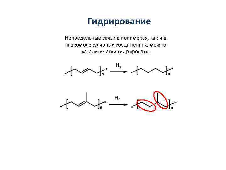 Гидрирование Непредельные связи в полимерах, как и в низкомолекулярных соединениях, можно каталитически гидрировать: