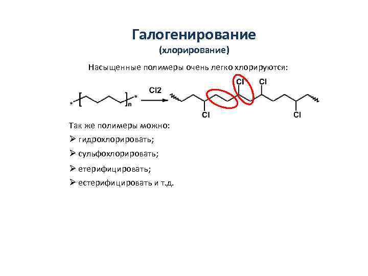 Галогенирование (хлорирование) Насыщенные полимеры очень легко хлорируются: Так же полимеры можно: Ø гидрохлорировать; Ø сульфохлорировать; Ø етерифицировать; Ø естерифицировать и т. д.