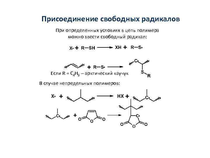 Присоединение свободных радикалов При определенных условиях в цепь полимера можно ввести свободный радикал: Если R = С 4 Н 9 – арктический каучук В случае непредельных полимеров: