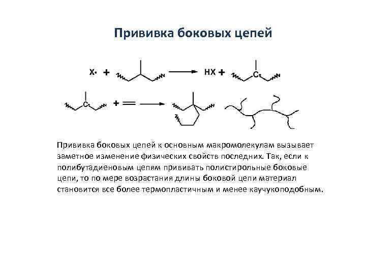Прививка боковых цепей к основным макромолекулам вызывает заметное изменение физических свойств последних. Так, если к полибутадиеновым цепям прививать полистирольные боковые цепи, то по мере возрастания длины боковой цепи материал становится все более термопластичным и менее каучукоподобным.