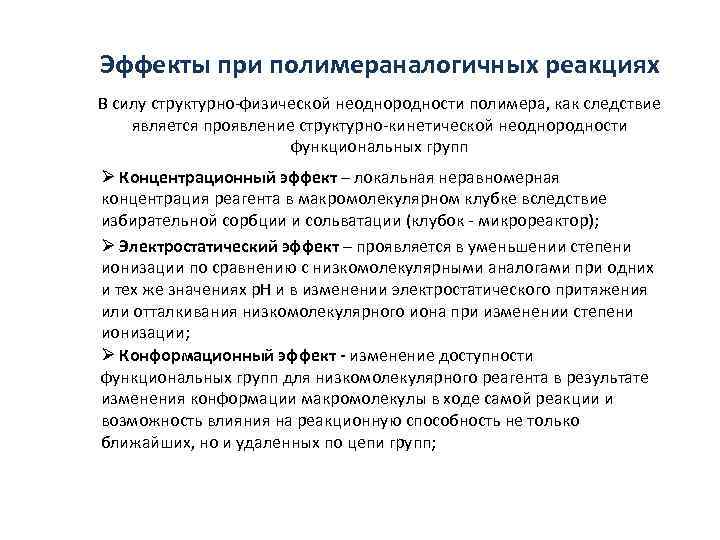 Эффекты при полимераналогичных реакциях В силу структурно-физической неоднородности полимера, как следствие является проявление структурно-кинетической неоднородности функциональных групп Ø Концентрационный эффект – локальная неравномерная концентрация реагента в макромолекулярном клубке вследствие избирательной сорбции и сольватации (клубок - микрореактор); Ø Электростатический эффект – проявляется в уменьшении степени ионизации по сравнению с низкомолекулярными аналогами при одних и тех же значениях р. Н и в изменении электростатического притяжения или отталкивания низкомолекулярного иона при изменении степени ионизации; Ø Конформационный эффект - изменение доступности функциональных групп для низкомолекулярного реагента в результате изменения конформации макромолекулы в ходе самой реакции и возможность влияния на реакционную способность не только ближайших, но и удаленных по цепи групп;