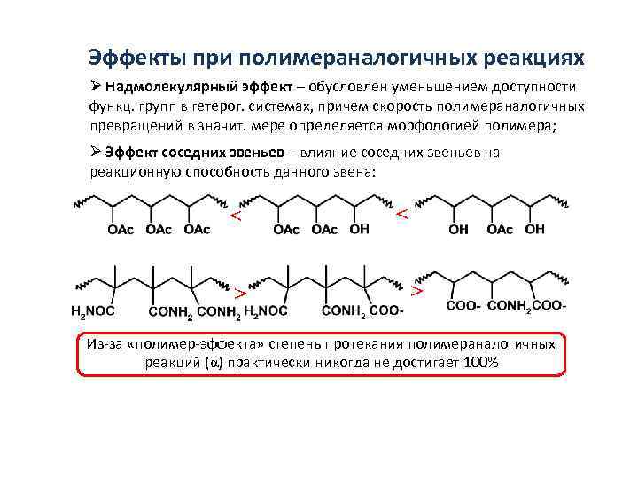 Эффекты при полимераналогичных реакциях Ø Надмолекулярный эффект – обусловлен уменьшением доступности функц. групп в гетерог. системах, причем скорость полимераналогичных превращений в значит. мере определяется морфологией полимера; Ø Эффект соседних звеньев – влияние соседних звеньев на реакционную способность данного звена: < > Из-за «полимер-эффекта» степень протекания полимераналогичных реакций (α) практически никогда не достигает 100%