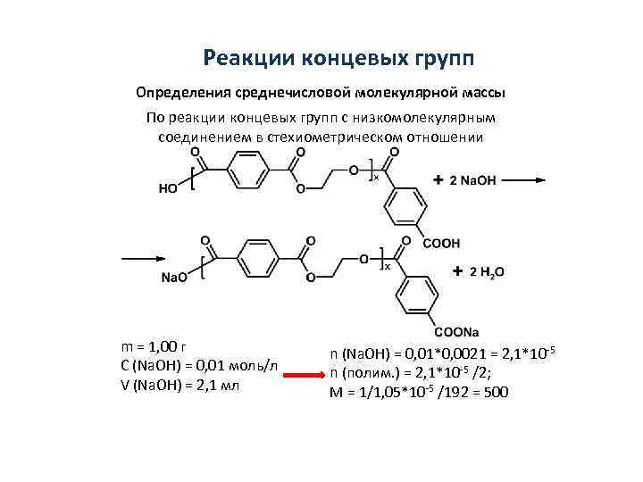 Реакции концевых групп Определения среднечисловой молекулярной массы По реакции концевых групп с низкомолекулярным соединением в стехиометрическом отношении m = 1, 00 г C (Na. OH) = 0, 01 моль/л V (Na. OH) = 2, 1 мл n (Na. OH) = 0, 01*0, 0021 = 2, 1*10 -5 n (полим. ) = 2, 1*10 -5 /2; M = 1/1, 05*10 -5 /192 = 500