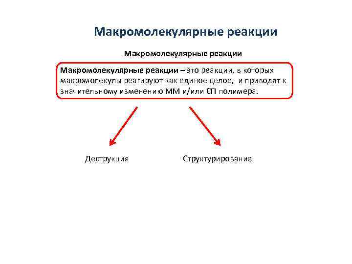 Макромолекулярные реакции – это реакции, в которых макромолекулы реагируют как единое целое, и приводят к значительному изменению ММ и/или СП полимера. Деструкция Структурирование
