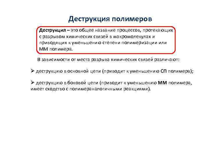 Деструкция полимеров Деструкция – это общее название процессов, протекающих с разрывом химических связей в макромолекулах и приводящих к уменьшению степени полимеризации или ММ полимера. В зависимости от места разрыва химических связей различают: Ø деструкцию в основной цепи (приводит к уменьшению СП полимера); Ø деструкцию в боковой цепи (приводит к уменьшению ММ полимера, имеет сходство с полимераналогичными реакциями).