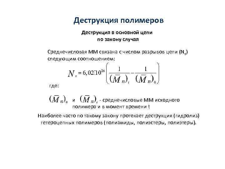 Деструкция полимеров Деструкция в основной цепи по закону случая Среднечисловая ММ связана с числом разрывов цепи (Ns) следующим соотношением: где: и - среднечисловые ММ исходного полимера и в момент времени t Наиболее часто по такому закону протекает деструкция (гидролиз) гетероцепных полимеров (полиамиды, полиэстеры, полиэтеры).