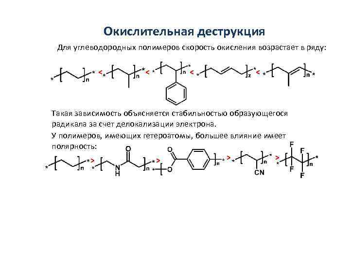 Окислительная деструкция Для углеводородных полимеров скорость окисления возрастает в ряду: < < Такая зависимость объясняется стабильностью образующегося радикала за счет делокализации электрона. У полимеров, имеющих гетероатомы, большее влияние имеет полярность: > >